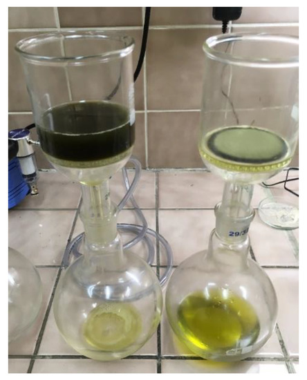 After the bleaching process, the mixture was poured into a Buchner funnel (Figure 6). Cellulose filters were used for filtration, on which bleaching earth was deposited. Filtration continued until a dry post-filter cake was obtained. The filtration time was unique and depended on the amount and type of soil used.