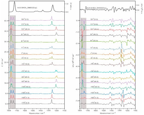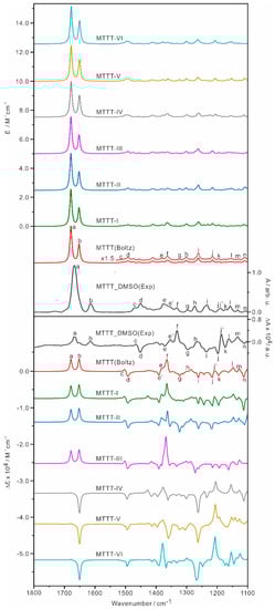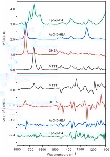 MTTT, DHEA, AcO-DHEA and Epoxy-P4 (HPLC purity > 98%) were purchased from CHENG-DU MUST BIO-TECHNOLOGY CO., LTD., (Chengdu, China) and used without further purification. DMSO-d6 and CCl4 were purchased from Sigma Aldrich (St. Louis, MA, USA). The IR and VCD spectra were measured using a FTIR spectrometer (Bruker Vertex 70), equipped with a VCD module (PMA 50) []. The photoelastic modulator (PEM) was set at 1400 cm−1 for all measurements. The signal detection occurred at the liquid nitrogen cooled mercury cadmium telluride (MCT) detector. The total acquisition time was 3 h (3 × 1 h) or about 13,000 scans with 4 cm−1 resolutions. The spectra were recorded in the region of 1100–1800 cm−1. MTTT and DHEA were measured in DMSO-d6 at a concentration of 80 mg/mL. AcO-DHEA and Epoxy-P4 were measured in DMSO-d6 at a concentration of 25 mg/mL and the same concentration was used for AcO-DHEA in CCl4. A 0.1 mm spacer was employed for all measurements. The concentration and the path length were optimized to get the IR absorbance in the range of 0.2–0.9, in order to obtain reproducible VCD spectra. The reported IR and VCD spectra were baseline corrected by the subtraction of the solvent spectrum, measured under identical conditions.