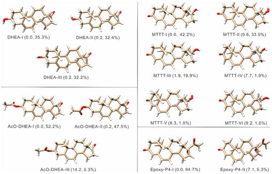 We chose to use the newly developed fast conformer-rotamer ensemble sampling tool, CREST []. CREST has been utilized and benchmarked extensively by us and others in rotational spectroscopic studies of a wide range of molecules and non-covalently bonded clusters [,,] and in IR chirality recognition studies of protonated amino acid binary aggregates []. Generally, the experimentally observed conformers were all identified in the CREST searches. One exception reported recently is the weakly bound heterochiral trimer of propylene oxide [] where the most stable geometry established experimentally is not a minimum in CREST. Another advantage of CREST is the readily available implicit solvation models for different solvents which can be used during a conformational search. We used DMSO for MTTT, DHEA, AcO-DHEA, and Epoxy-P4 conformational searches. Some additional loose geometry optimizations and single point energy evaluation steps are described in Section 3, Materials and Methods, as well as other CREST details. In total, 12 AcO-DHEA, eight DHEA, 10 MTTT and four Epoxy-P4 candidates were generated after the initial CREST searches. The final geometry optimizations were carried out at the B3LYP [,]-D3BJ/def2-TZVPD [], B3LYP-D3BJ/6-31++G(2d,p) [], and/or B3LYP-D3BJ/cc-pVTZ [] levels of theory with the polarizable continuum model (PCM) [] of DMSO. The D3 dispersion correction [,] with the Becke–Johnson (BJ) damping function [] was used. This procedure generated six MTTT, three AcO-DHEA, three DHEA, and two Epoxy-P4 conformers within an energy window of 10 kJ mol−1. The corresponding optimized geometries are depicted in Figure 2, together with their relative free energies and their Boltzmann percentage abundances at 298 K.