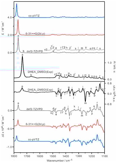 The Boltzmann averaged IR and VCD spectra of the three most stable conformers of DHEA were simulated using three different basis sets: cc-pVTZ, 6-31++G(2d,p) and def2-TZVPD. The B3LYP-D3BJ/def2-TZVP has been utilized extensively by the rotational spectroscopic community and the inclusion of an additional set of diffuse functions, i.e., def2-TZVPD, appeared to provide even better performance for conformational geometries and their energy ordering, with little additional computational cost []. It is interesting to compare its performance with the other two basis sets often used by the VCD and ROA community. The simulated spectra are compared with the experimental spectra in Figure 3, while the simulated IR and VCD spectra of individual DHEA conformers at the B3LYP-D3BJ/def2-TZVPD level are presented in Figure S5. The relative free energies and Boltzmann population factors of each conformer obtained with each basis set are compared in Table S1. Overall, the simulated spectra obtained with the three different basis sets are quite consistent with each other.