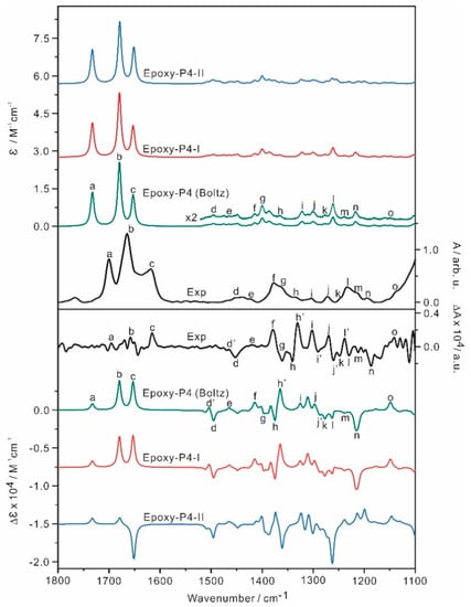 Simulated IR and VCD spectra of the two most stable Epoxy−P4 conformers, Epoxy−P4−I and −II, and the related Boltzmann averaged IR and VCD spectra at the B3LYP−D3BJ/def2−TZVPD/PCM(DMSO) level of theory at 298 K. The experimental units are on the right side. The main IR and VCD band features are labelled as ‘a’ to ‘o’ to aid the comparison.