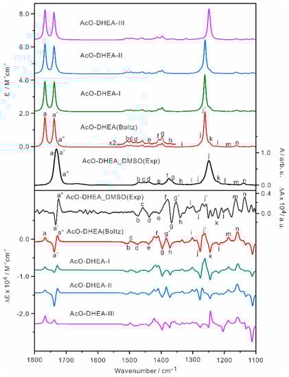 For AcO-DHEA, the individual and Boltzmann averaged IR and VCD spectra of AcO-DHEA-I to III are shown in Figure 6. To assist the comparison, all the corresponding visible bands are labelled alphabetically as ‘a’ to ‘n’. Overall, the simulated IR and VCD spectral features show a reasonably good agreement with the experimental data. One exception is the bands in the 1700–1800 cm−1 region. There are three vibrational bands predicted in this region: the C=O stretch of cyclopentanone, band a, the C=O stretch of AcO, band a′, and the C=C stretch, band a′′ going from high to low cm−1. In the IR prediction, the C=C band (band a″) is very weak and buried in the lower wavenumber side of the C=O band (band a´), whereas in the corresponding VCD features, we have a negative band a′ and a positive band a′′ with medium intensity. One can correlate the experimental VCD −/+ features to the predicted −/+ features of band a′ and band a′′. How about the C=O stretch of cyclopentanone, i.e., band a? It is obvious that the gap between band a and band a′ was predicted to be much larger than that observed experimentally. In fact, in the experiment, the two C=O bands merge into one slightly broader band. Furthermore, if one moves band a closer to band a′ as implied by the experimental IR feature in this region, the positive VCD band a would cancel out some negative VCD intensity of band a′, leading to better relative intensity agreement with the experimental −/+ VCD features. Overall, one can conclude that the DFT calculation at this level of theory accurately captures the IR and VCD features of AcO-DHEA, except for the narrow gap between the C=O stretch of cyclopentanone and C=O of the AcO group.