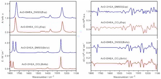 First, we examined whether the DMSO solvent causes these bands (>1700 cm−1) to merge into one or not. The IR and VCD spectra of AcO-DHEA were subsequently measured in CCl4, and their experimental spectra are compared with those obtained in DMSO in Figure 7. It is clearly that these two sets of experimental data exhibit much similarity in both IR and VCD features, including the fact that only one IR band (>1700 cm−1) was observed in CCl4, similar to that in DMSO. We can safely say that solvents do not cause these predicted split bands to merge together. Some noticeable differences in these solvents are: (1) the broad carbonyl band, which is located at ~1731 cm−1 in DMSO-d6, is blue shifted by ~11 cm−1 in CCl4; (2) the associated VCD features also change from −/+ in DMSO to −/− in CCl4; and (3) the IR C-O band around 1250 cm−1 is slightly red shifted from DMSO to CCl4, opposite to that of the carbonyl band.