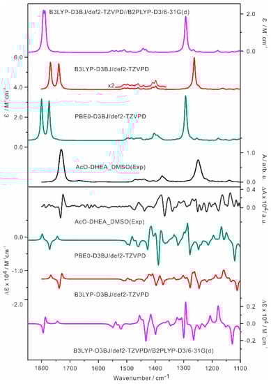 The averaged IR and VCD of AcO-DHEA at the PBE0-D3BJ/def2-TZVPD level are summarized in Figure 9 and compared with the experiment and those simulated with B3LYP-D3BJ. While the PBE0 simulations do not solve the issue associated with the IR band frequencies in the >1700 cm−1 region, the IR and VCD patterns in the <1600 cm−1 region appear to agree even better with the experimental ones than those predicted with the B3LYP-D3BJ functional if one shifts the whole spectrum to a lower wavenumber. More specifically, the IR band shapes in the 1300–1500 cm−1 region and their relative intensity to the strong band at 1250 cm−1 were also better captured at the PBE0 level. So were the detailed VCD features in the same region.