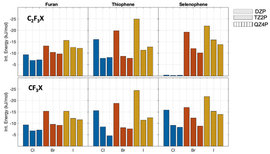 The starting geometries of the weakly bonded complexes were built by using the Amsterdam Modelling Suite–Graphical User Interface (AMS-GUI). The aromatic molecule (furan/thiophene/selenophene) was complexed with a small molecule with sp, and sp hybridization (CFX or CFX, with X = Cl, Br, I), which were placed in a parallel and perpendicular orientation, Figure 1. This procedure rendered 36 different geometries.