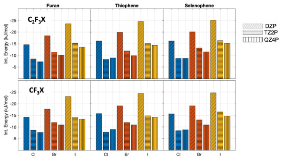 PBE0−dDsC interaction energies (without zero-point vibrational energy correction) with different basis sets for the complexes oriented in perpendicular. The halogen atoms are depicted with the following colormap: chlorine blue, bromine red, and iodine yellow. The DZP basis set is represented with slanted lines, the TZ2P with horizontal lines, and QZ4P with vertical lines.