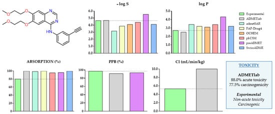 Comparison of the experimental data of Erlotinib (3) and the predictions obtained from ADMETlab, admetSAR, FAF-Drug4, OCHEM, pkCSM, preADMET, and SwissADME for solubility (log S), log P, absorption, plasma protein binding, clearance, acute toxicity, and carcinogenicity.