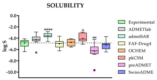 The statistical analysis between the experimental and predicted log S is presented in Figure 3. The boxplot graphic already shows that some of the web servers produce more accurate predictions than others, which is confirmed by the p-values obtained for the pairwise t-test. For our group of study (n = 11), the best fit is achieved by the FAF-Drug4 and OCHEM platforms, while on the other side, there are admetSAR (p-value of 7.56 × 10−5), pkCSM, and preADMET, which gave a predicted solubility far from reality.