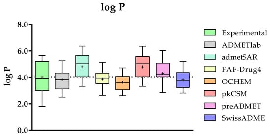 Comparison of the experimental and predicted data for the octanol/water coefficient (log P) between ADMETlab, admetSAR, FAF-Drug4, OCHEM, pkCSM, preADMET, and SwissADME. Statistical analysis was performed by a pairwise t-test (n = 15) versus experimental data.