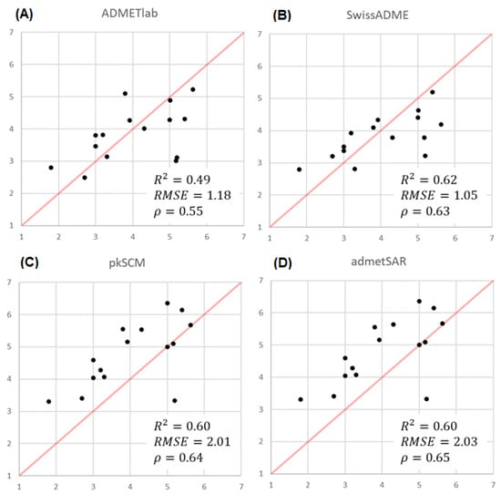 ADMETlab, pkSCM, SwissADME, and admetSAR are the models with the highest Pearson’s correlation coefficient (Figure 5). From the prediction point of view, the assessment of the regression fitting obtained for these methods shows that ADMETlab and SwissADME offer the lowest Root Mean Square Error (RMSE) value. Particularly, SwissADME is the method with the highest correlation with the experimental values (R2 = 0.62, ρ = 0.63). However, it is important to highlight that the range of the experimental values (1.8 to 5.63) for the group of TKIs is larger than the ranges predicted by each of the websites.