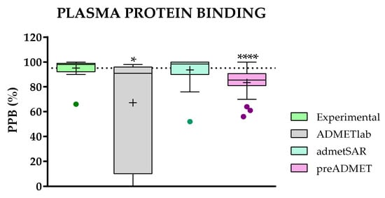 Comparison of experimental and predicted data for plasma protein binding (PPB) between ADMETlab, admetSAR, and preADMET. Statistical analysis was performed by a pairwise t-test (n = 24, * p ≤ 0.05, ** p ≤ 0.01, *** p ≤ 0.001, and **** p ≤ 0.0001) versus experimental data.