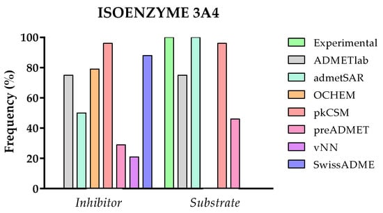 Comparison of experimental and predicted data between ADMETlab, admetSAR, OCHEM, pkCSM, vNN, and SwissADME for the inhibition or being a substrate of the 3A4 isoenzyme (n = 24).
