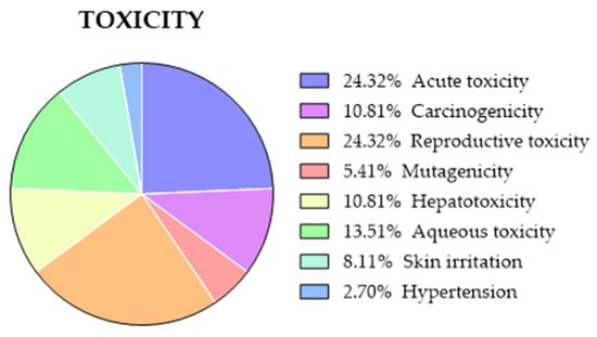 The websites that run toxicity properties are ADMETlab, admetSAR, pkCSM, preADMET, and vNN, although the last one returns an out-of-domain for the 24 TKIs, similar to what happened with metabolism predictions. ADMETlab and admetSAR return the probability of a compound being toxic, while, on the other side, pkCSM and preADMET classify the toxicity of compounds as yes/no or high/medium/low, respectively. All predicted data are included in Table S4.