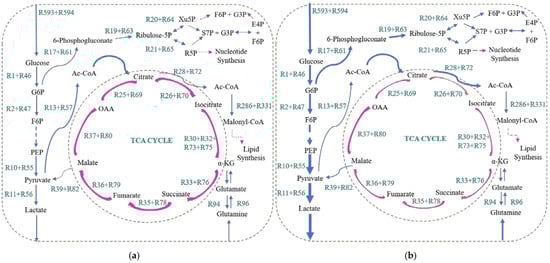 (a) Modeling healthy and (b) MB models. Low-flux and high-flux reactions are shown in thinner and thicker arrow, respectively. In addition to glycolysis, pentose phosphate pathway (PPP), tricarboxylic acid (TCA) cycle, flux change in other pathways for both models and corresponding reactions for reaction IDs are available in FBA results section of Supplementary Material S2.