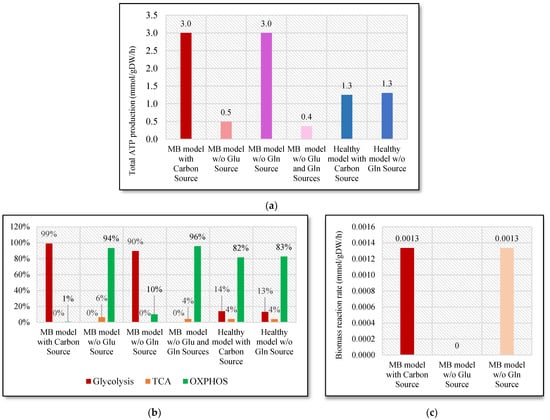 (a) Changes in total ATP generation rate; (b) Biomass reaction rate; (c) Energy generation distribution with respect to glucose (Glu) and/or glutamine (Gln) deficiencies in MB and healthy models.