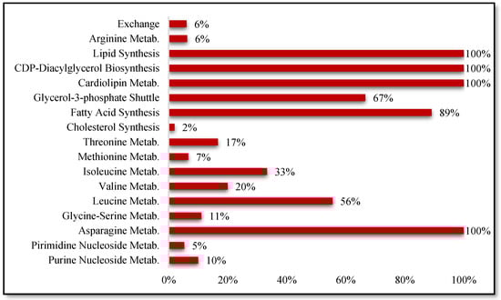 Single/double gene and reaction deletion analyses were performed to be able to find potential therapeutic targets for MB. In essentiality analysis, eight genes out of forty-two were removed as they significantly affected the main functions of the healthy cells (see Supplementary Material S2). When these genes were eliminated, the single-gene and reaction deletion analyses indicated that 68% of essential genes and reactions were associated with the main lipid metabolism.