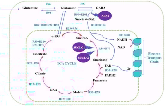 Combinations of the ABAT gene with succinate-CoA ligase ADP-forming subunit beta (SUCLA2) and succinate-CoA ligase GDP/ADP-forming subunit alpha (SUCLG1) genes that regulate succinate synthesis (R34 + R77) from succinyl-CoA in the TCA cycle were also determined by the MB model (Figure 7). The activity of GABA transaminase (ABAT), which controls SuccinateSAL and glutamate productions (R99 + R101) from alpha-ketoglutarate and GABA, is relatively lower in primary MB than in healthy cerebellum since overexpression of ABAT in MB decelerates proliferation and increases the activity of OXPHOS [12,47]. In fact, in more malignant types of MB, in GR3 and GR4 subtypes, ABAT was found to be less active than SHH and WNT. Furthermore, activation of ABAT was observed to trigger apoptosis and diminish cancer cell division in rats with MB [47]. However, recently, ABAT expression was found to be enhanced in metastatic MB in comparison to primary MB in order to meet its energy needs by utilizing GABA [47]. That is, metastatic tumor cells were detected to rely on OXPHOS to obtain enough energy and to withstand hard conditions. In addition, the ABAT gene was found to be crucial for metastatic cells because ABAT recharges the metabolites necessary for the TCA cycle and OXPHOS by contributing to succinate and NADH productions.