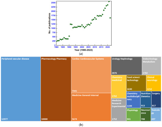 (a) Point graph presenting yearly publications and (b) a tree graph presenting publications in different areas of research (Web of Science search data obtained on 22 October 2022 using keywords dihydropyrimidines or calcium channel blockers, from January 1980 to October 2022).