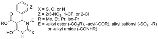 - Atwal, K.S.; Rovnyak, G.C.; Schwartz, J.; Moreland, S.; Hedberg, A.; Gougoutas, J.Z.; Malley, M.F.; Floyd, D.M. Dihydropyrimidine calcium channel blockers: 2-heterosubstituted 4-aryl-1, 4-dihydro-6-methyl-5-pyrimidinecarboxylic acid esters as potent mimics of dihydropyridines. J. Med. Chem. 1990, 33, 1510–1515. [Google Scholar] [CrossRef] [PubMed]