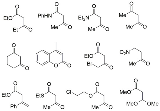 In addition, numerous CH-acidic carbonyl building blocks such as ethyl 3-oxopentanoate, 3-oxo-N-phenylbutanamide, N,N-diethyl-3-oxobutanamide, pentane-2,4-dione, 1-nitropropan-2-one, ethyl 4-bromo-3-oxobutanoate, 4-methyl-2H-1-benzopyran-2-one, cyclohexane-1,3-dione, ethyl 3-oxo-3-phenylpropanoate, 2-ethyl 3-oxobutanethioate, 2-chloroethyl 3-oxobutanoate, and methyl 3,3-dimethoxypropanoate can also be used in Biginelli reactions (Figure 6). Traditionally, simple alkyl acetoacetates are employed as CH-acidic carbonyl building blocks, but other types of 3-oxoalkanoic esters or thioesters can also be used successfully. For instance, the equivalent 6-chloromethyl-substituted DHPMs with 4-chloroacetate can act as important templates for additional synthetic transformations, as shown in Scheme 2.