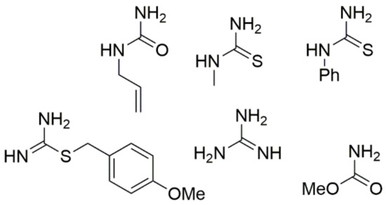 Nitroacetone is a useful building block for creating 5-nitro-substituted DHPM derivatives with good yields, in addition to ester-derived CH-acidic carbonyl compounds. The corresponding method is shown in Scheme 8. Furthermore, the urea component in the Biginelli reaction faces the most restrictions in terms of the structural diversity allowed. Therefore, most of the published examples involve urea itself as a building block. However, simple monosubstituted alkyl urea generally reacts equally well in a regiospecific manner to provide good yields of N1-substituted DHPMs. Some similar units such as N-(prop-2-en-1-yl)urea, N-methylthiourea, N-phenylthiourea, methyl carbamate, (4-methoxyphenyl)methyl carbamimidothioate, and guanidine are provided in Figure 7.