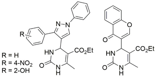 Thiourea and substituted thioureas follow the same general rules. However, longer reaction times are required to achieve good conversions. In some instances, it is also possible to use protected urea, thioureas, or guanidines under weak basic conditions with the aldehyde and CH-acidic carbonyl component (or with a precondensed Knoevenagel-type enone) to yield the corresponding protected DHPMs, as shown in Scheme 9. This latter method using precondensed enones has been frequently referred to as the ‘‘Atwal modification of the Biginelli reaction”. Twenty years ago, a huge number of DHPMs were synthesized and evaluated to determine their biological activities as antiviral; anti-tumor; antibacterial; anti-inflammatory; and, more recently, anti-hypertensive agents. In 2003, some Biginelli products were synthesized by Wageeh S. El-Hamouly et al. and screened to determine their antihypertensive activity (Figure 8). The findings obtained demonstrated that there was a strong anti-hypertensive activity in the series created using 4-chromonyl derivative. Among the synthesized compounds, the 4-chromonyl derivative showed a better anti-hypertensive potency than 4-pyrazolyl analogues and even than the standard drug nifedipine. With the aid of non-selective cat models, the group concluded that the dihydropyrimidines substituted with aryl functionalities were more potent than the dihydropyrimidones substituted with the same aryl functionalities.