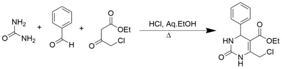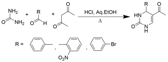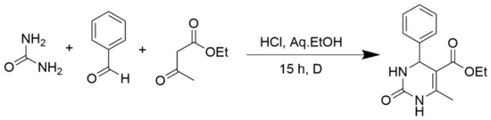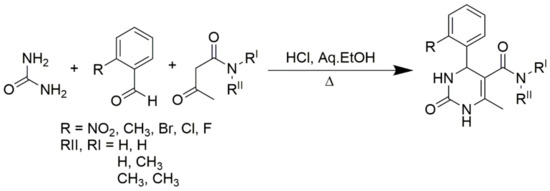- Hu, E.H.; Sidler, D.R.; Dolling, U.-H. Unprecedented catalytic three component one-pot condensation reaction: An efficient synthesis of 5-alkoxycarbonyl-4-aryl-3, 4-dihydropyrimidin-2 (1H)-ones. J. Org. Chem. 1998, 63, 3454–3457. [Google Scholar] [CrossRef]