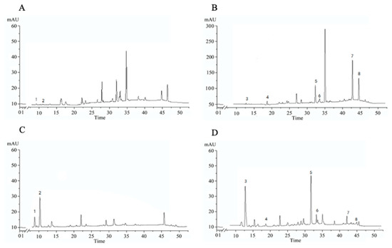 Quantitative determination of the eight ingredients in LLF and WLL extracts were performed. Before analysis, the LLF and WLL extracts (0.10 g) were dissolved in 50 mL of 50% methanol and filtered through a 0.22 μm membrane.