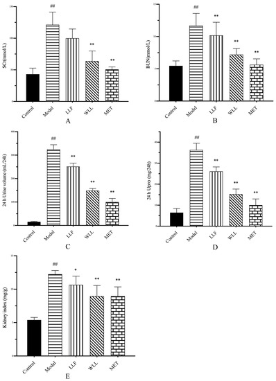 44]. The 24-h Upro of DN rats increased significantly. After treatment with LLF and WLL extracts, the urine excretion of these proteins was significantly reduced; the effect of the WLL extract was better than that of the LLF extract.