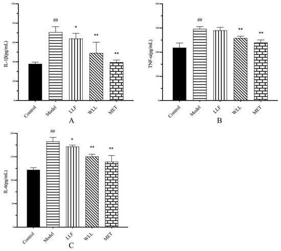 45]. Oral administration of LLF and WLL extracts can significantly inhibit the release of pro-inflammatory mediators (TNFα, IL-6, and IL-1β) in the serum of DN rats, indicating that the anti-inflammatory effects of LLF and WLL extracts may be related to kidney protection in DN; meanwhile, the anti-inflammatory effect of the WLL extract was better than that of the LLF extract.