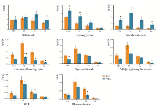 d-glucosylformoside, specnuezhenide, G13, and oleonuezhenide were decreased in WLL. In kidney tissue, the concentration of salidroside, hydroxytyrosol, and nuezhenidic acid increased in WLL compared with LLF, while oleoside-11-methyl ester, 1‴-O-β-