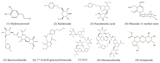 The standards for G13, oleonuezhenide, nuezhenidic acid, and oleoside-11-methyl ester were purchased from Shanghai Yilin Biotechnology Co., Ltd. (Shanghai, China), specnuezhenide was purchased from Chengdu Biopunify Phytochemicals Co., Ltd. (Chengdu, China), hydroxytyrosol and geniposide were provided by Chengdu Must Biotechnology Co., Ltd. (Chengdu, China), and 1‴-O-β-D-glucosylformoside and salidroside were obtained from Shanghai Yuanye Biotechnology Co., Ltd. (Shanghai, China). The purity of these standards was greater than 98%. The chemical structures are presented in