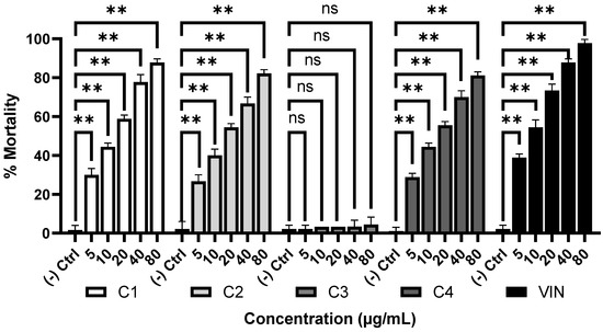 - Meyer, B.N.; Ferrigni, N.R.; Putnam, J.E.; Jacobsen, L.B.; Nichols, D.E.; McLaughlin, J.L. Brine shrimp: A convenient general bioassay for active plant constituents. Planta Med. 1982, 45, 31–34. [Google Scholar] [CrossRef]