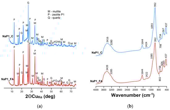 The FTIR spectra confirmed the observations made by XRD (Figure 1b). A wide, broad band of 3600 to 3100 cm−1 for both materials corresponded to the stretching vibrations of hydroxyl groups from the adsorbed water molecules in zeolite channels [56,57]. All materials showed clear bands at approximately 1644, 1424, and 738 cm−1. These can be attributed to the bending vibrations of H–OH (indicating that the samples contain a fraction of free-state water adsorbed on the surface or inside the structural cavities), the O–C–O stretching vibration associated with carbonates and the stretching vibrations of the Si–O–Si/Si–O–Al bonds in the tetrahedra. A band at around 1090 cm−1 registered for NaP1_FA and NaP1_C may be attributed to the stretching vibration of C–OH. The bands at 565–567 cm−1 corresponded to the mullite admixture. As reported by [58], the presence of mullite is also confirmed by the presence of bands at 1099 and 811 cm−1. In the present study, the bands responsible for mullite were observed at 1085 and 802 cm−1 (NaP1_FA), and 1093 and 798 cm−1 (NaP1_C). The bands at 734–738 cm−1 and 604 cm−1 were attributable to Si–O–Si/Si–O–Al and Al–O/Si–O bending vibrations, respectively [58]. As reported by [59], the bands at 738 and 690 cm−1 (weak band visible in Figure 1b) in the P1 zeolite are attributable to symmetric stretching vibrations of the internal tetrahedron. These authors have also stated that the band centered at 605 cm−1 (Figure 1b—NaP1_FA) corresponds to the presence of a double ring in the P1 zeolite. The band vibration of the TO4 (T = Si or Al) tetrahedral in zeolite P1 was observed at 437 cm−1 (Figure 1b). These peaks agree well with the literature and confirm the successful synthesis of zeolite P1 [60,61]. Most importantly, a sharp band of high intensity at around 990 cm−1 observed for NaP1_FA and NaP1_C confirmed the formation of a well-defined aluminosilicate skeleton. These bands can be attributable to the asymmetric stretching vibrations of bridge bonds Si–O(Si) and Si–O(Al) in the zeolite frameworks.