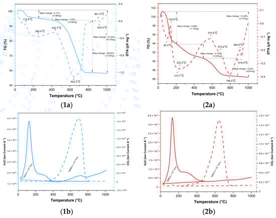 Woszuk et al. [62] conducted a thermal analysis in which the effect of NaP1_FA and clinoptilolite as additives to asphalt materials was investigated. Endothermic effects (about 100 °C) and mass loss reaching a maximum of 6% for the NaP1_FA sample were compared with the data in Figure 2(1a,2a).