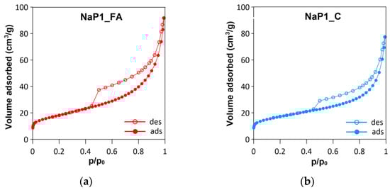 For the analyzed materials, type IV isotherms were identified according to the IUPAC classification (Figure 3a,b). A hysteresis loop belonging to the H3 type reflected the presence of slit-shaped mesopores. This shape of isotherms was consistent with those often found for aggregated crystals of zeolites and micromesoporous carbons [65]. The SBETs of NaP1_FA and NaP1_C were similar and approximately 60 m2 g−1. However, the NaP1_FA zeolite P1 was characterized by a larger volume of mesopores.