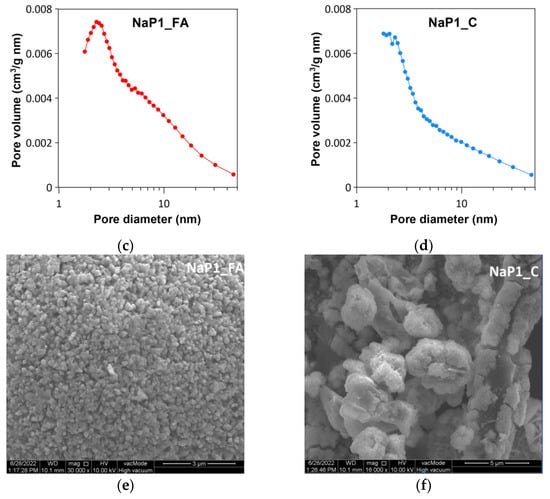 Textural analysis of NaP1_FA and NaP1_C samples: (a,b) N2 adsorption/desorption isotherms, (c,d) pore size distribution diagrams, and (e,f) SEM microphotographs.