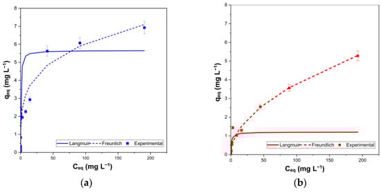 The adsorption capacity reached 5.66 and 7.14 mg g−1 for the NaP1_C sample according to the Langmuir and Freundlich models, respectively. However, for the NaP1_FA sample, it reached 1.19 and 5.72 mg g−1 for the two models, respectively. Much higher concentration values were obtained using the Freundlich model for the NaP1_C sample. In all cases, the regression coefficient (R2) of the linear fit for both samples was >0.74.