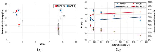 The experiments performed at different initial pH values allowed us to evaluate the changes in EA removal efficiency by the two zeolitic adsorbents (Figure 5a). A decline in the efficiency for the NaP1_FA material was observed following an increase in pH. Under acidic conditions (initial pH of 2.0), the removal was around 80%, whereas it was decreased to around 30% for a pH of 8.0. In contrast, pH did not affect EA removal by NaP1_C. A removal of around 80% was observed regardless of pH conditions. This may indicate that hydrophobic interactions dominate in the reaction of EA with NaP1_C, which is rich in carbon. On the other hand, larger amounts of the hydrophilic surface of NaP1_FA being available results in polar interaction with EA, which is sensitive to pH.