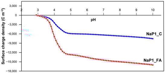 Surface charge density of NaP1_C and NaP1_FA as a function of solution pH.