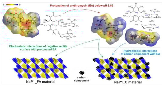 A model showing the possible interactions of EA with zeolitic materials is presented in Figure 7. It shows two types of mechanisms: (i) the electrostatic interaction of protonated EA with the negatively charged surface of zeolites and (ii) the hydrophobic interaction of EA with the carbon component present in NaP1_C. In particular, the latter mechanism is responsible for highly efficient adsorption.