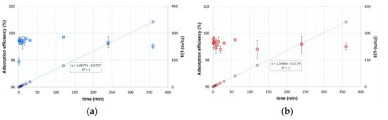 In line with the above assumptions, curves representing the BMG kinetic model were drawn (Figure 8). These curves were supplemented with values of EA retention by the adsorbents, which were expressed in percentages.