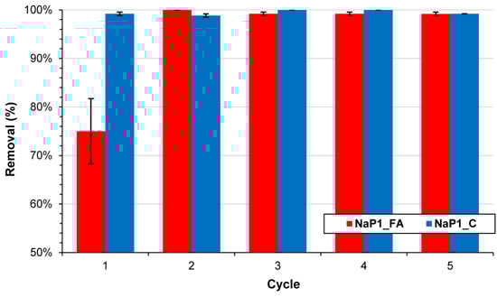 The regeneration possibility and stability of NaP1_FA and NaP1_C adsorbents are important for their future use. To evaluate the reusability of these adsorbents, a total of five adsorption/desorption cycles were conducted, and the results are presented in Figure 9. The adsorbents were rinsed once with ethanol after each adsorption cycle and then reused for the next adsorption step [73,80]. The results showed that there is no significant decrease in EA removal efficiency after five cycles of regeneration, suggesting that both adsorbents are stable and can be further reused.