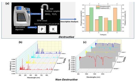 In place of a long chemical process combined with traditional sensors techniques such as FAAS, GF-AAS, ICP-OES, and ICP-MS, sensor techniques such as laser-induced breakdown spectroscopy (LIBS) and visible and near-infrared reflectance spectroscopy (Vis-NIR) enable the rapid screening of the PK content in various organic fertilizers. LIBS is an emission spectroscopy technique where atoms and ions are created in exciting conditions due to the interaction between a tightly focused laser beam and the material sample. This technology has become popular as it can analyze different materials, such as food, soil, and fertilizer [6,7,8]. Conversely, Vis-NIR is another alternative tool that offers more and better advantages than standard chemistry. This method is non-invasive, has a high penetration rate of radiation beams, is suitable for inline use, and does not require sample preparation [9]. It has also been used to analyze numerous samples, such as food and soil [10,11]. Both methods are inexpensive, easy, non-destructive, and rapid to execute. However, they generate a tremendous amount of data, necessitating the application of chemometrics.