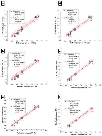 Prediction error plot of PK for calibration and prediction set using Extratrees; (a) Prediction error plot of P using LIBS-Shap spectra; (b) Prediction error plot of P using full Vis-NIR-Shap spectra; (c) Prediction error plot of P using FUSION spectra; (d) Prediction error plot of K using LIBS-Shap spectra; (e) Prediction error plot of K using Vis-NIR-Shap spectra; (f) Prediction error plot of K using FUSION spectra. The red area means 95% of prediction intervals.