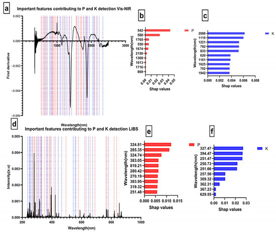Important features contributing to PK detection using Extratrees; (a) Important features for Vis-NIR with a red dot representing P features and a blue dot representing K features; (b) Ten features with highest Shap values for P using Vis-NIR; (c) Ten features with highest Shap values for K using Vis-NIR; (d) Important features for LIBS with the red dot representing P features and a blue dot representing K features; (e) Ten features with highest Shap values for P using LIBS; (f) Ten features with highest Shap values for K using LIBS.