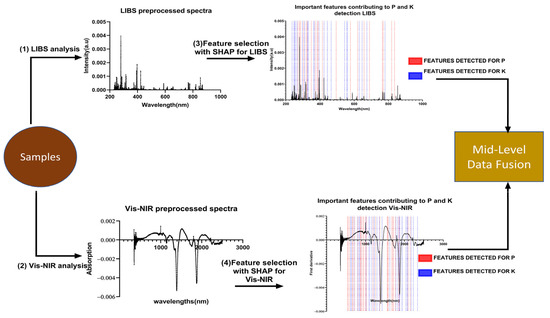 Overall, the features with the highest Shap values for LIBS, called LIBS-Shap, were concatenated to the features with the highest Shap values for Vis-NIR, called Vis-NIR-Shap, to improve the quantification of P and K. The Scheme of the data fusion process of mid-level using Shap values can be found in Figure 6.