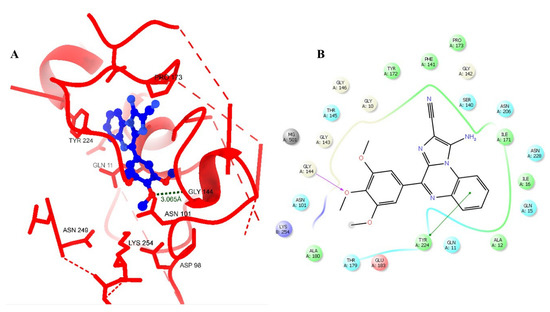 The pharmacophores and their binding model could provide critical insights for a rational structure-based drug design. Therefore, we developed a pharmacophore for one of our prototype’s compounds. The model revealed that the pharmacophore of our synthetic compound possessed six pharmacophore groups: a hydrogen bond donor (D); a hydrogen bond acceptor (A); a hydrophobic group (H); an aromatic ring (R); a positively charged group (P); and a negatively charged group (N). Thus, these satisfied our quest for an optimal pharmacophoric requirement among a series of developed imidazo[1,2-a]quinoxaline derivatives [14].