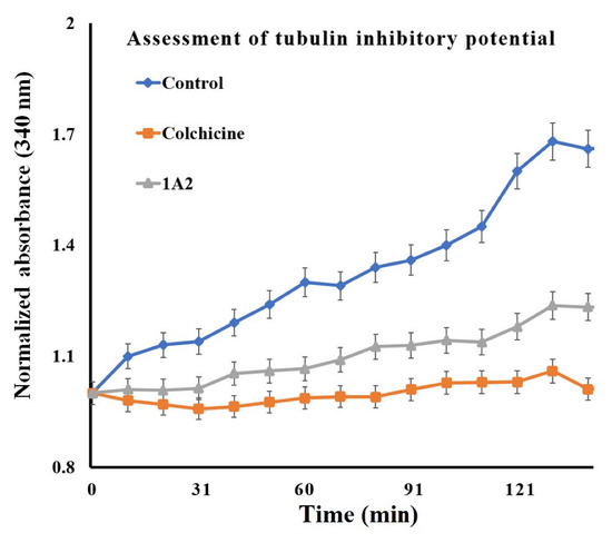 As a standard protocol, the in vitro tubulin-binding affinity of 1A2 was evaluated against bovine tubulin via a tubulin polymerization inhibitory assay [25]. In brief, compound 1A2 or colchicine was added to 96-well plates in a 10 µM concentration (final concentration), followed by the addition of bovine tubulin (1.8 mg/mL; Sigma Aldrich, Mumbai, Maharashtra, India) suspended in an ice-cold polymerization buffer (which was earlier centrifuged for 5 min at 4 °C and the supernatant was used). After addition of the tubulin, the 96-well plate was quickly transferred to a spectrophotometer set at a temperature of 37 °C. For 2.5 h, the absorbance was measured at the wavelength of 340 nm every 10 min. The experiments were performed in triplicate and the mean of these results was expressed.