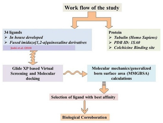 A total of 34 compounds belonging to imidazo[1,2-a]quinoxaline derivatives from a library [12] were selected for a virtual screening and molecular docking against the tubulin protein (PDB: 1SA0). The details of the chemical structure are provided in Figure 6. These derivatives (34) were further chosen for in silico-based studies to identify the best putative lead compound among them. Colchicine served as a positive control during the conducted studies.